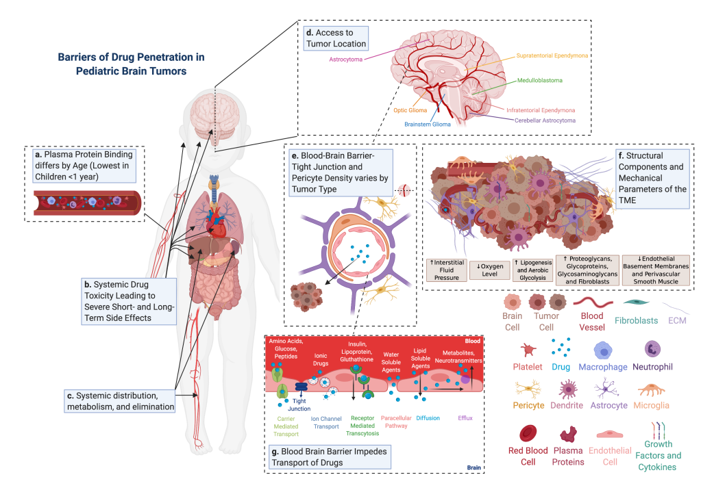 Larger clinical trial enrollments and a greater understanding of biological heterogeneity have led to improved survival rates for children diagnosed with brain tumors in the last 50 years. However, reducing long-term morbidities and improving survival rates of high-risk tumors remain major challenges. Chemotherapy can reduce tumor burden, but effective drug penetration at the tumor site is limited by barriers in the route of drug administration and within the tumor microenvironment. Bioavailability of drugs is impeded by the blood-brain barrier, plasma protein binding, and structural components by the tumor including the matrix and vasculature contributing to increased interstitial fluid pressure, hypoxia, and acidity. Designing drug delivery systems to circumvent these barriers could lead to improved drug penetration at the tumor site and reduce adverse systemic side effects. In this review, we expand on how systemic and local barriers limit drug penetration and present potential methods to enhance drug penetration in pediatric brain tumors.