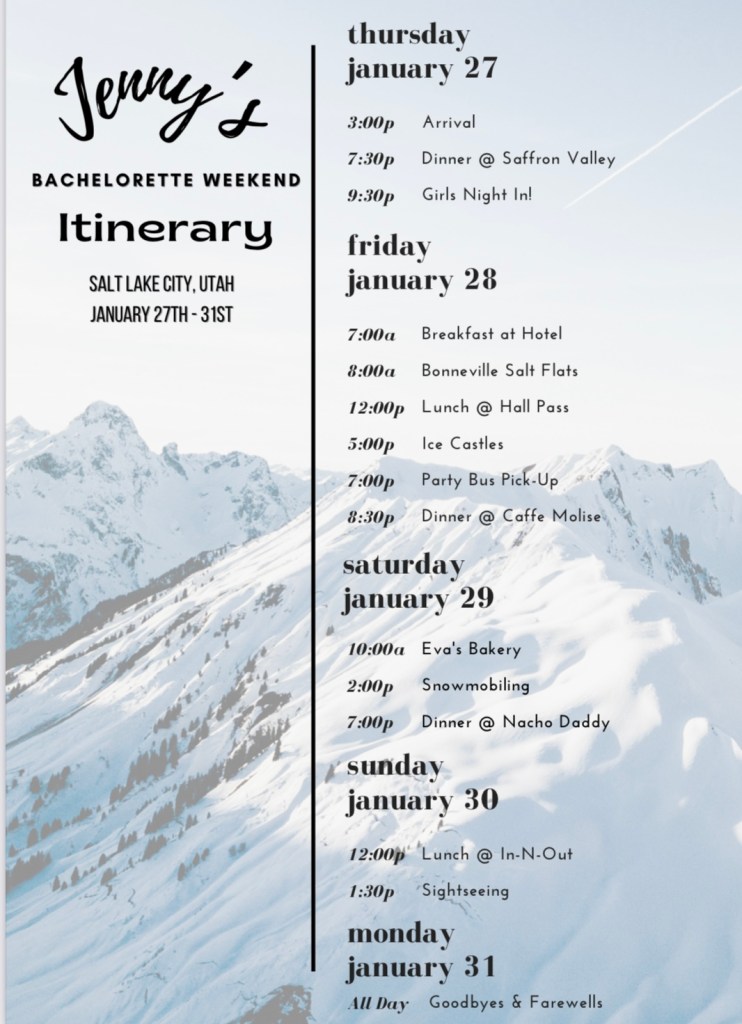 A big shout out to my girls for planning out the most adventurous bachelorette in 2 weeks! I had originally chosen Banff, Alberta Canada as the location and plans had been in the works for months prior, but then Covid regulations became strict just a few weeks before the trip. The plans got cancelled about 2 weeks before the bachelorette dates. I still wanted a snowy adventurous bachelorette which was when Utah was brought up, one of my favorite states! The girls planned an itinerary in 2 weeks and off we went. Below is more information on the adventurous highlights from the trip.